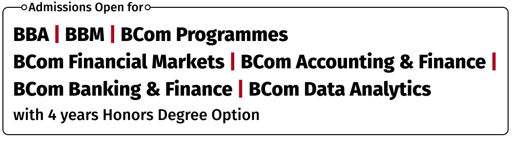 | Minors | Marketing, Management, Data Science and Analytics, Web Designing, Cybersecurity, Accounting, Taxation, Finance, Financial Markets, Investment Banking, Commercial Data Science, Banking, Biotechnology, Mass Communication, Embedded Systems, User Interface & User Experience (UI & UX), Nanotechnology & IPR, Bioinformatics and Omics. |